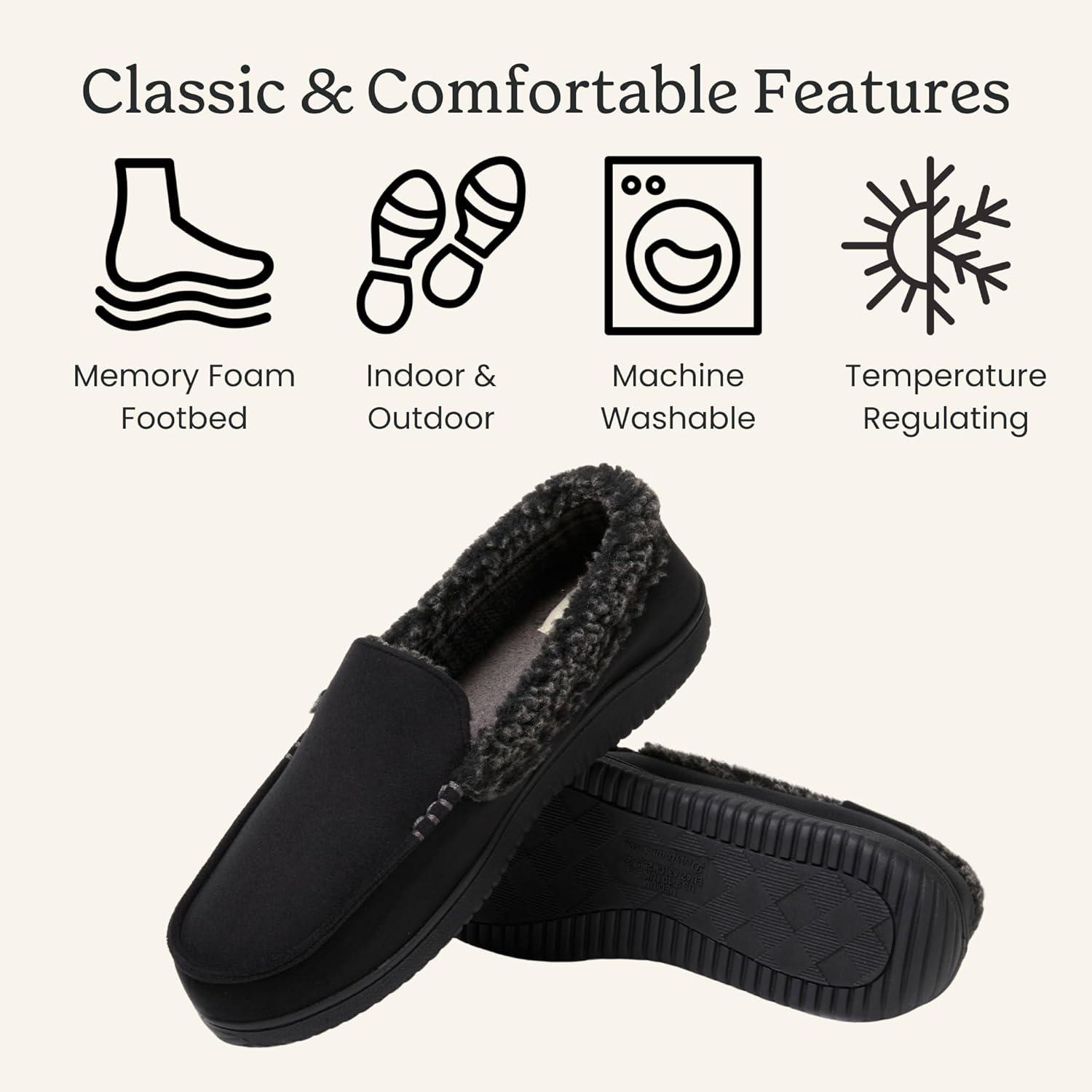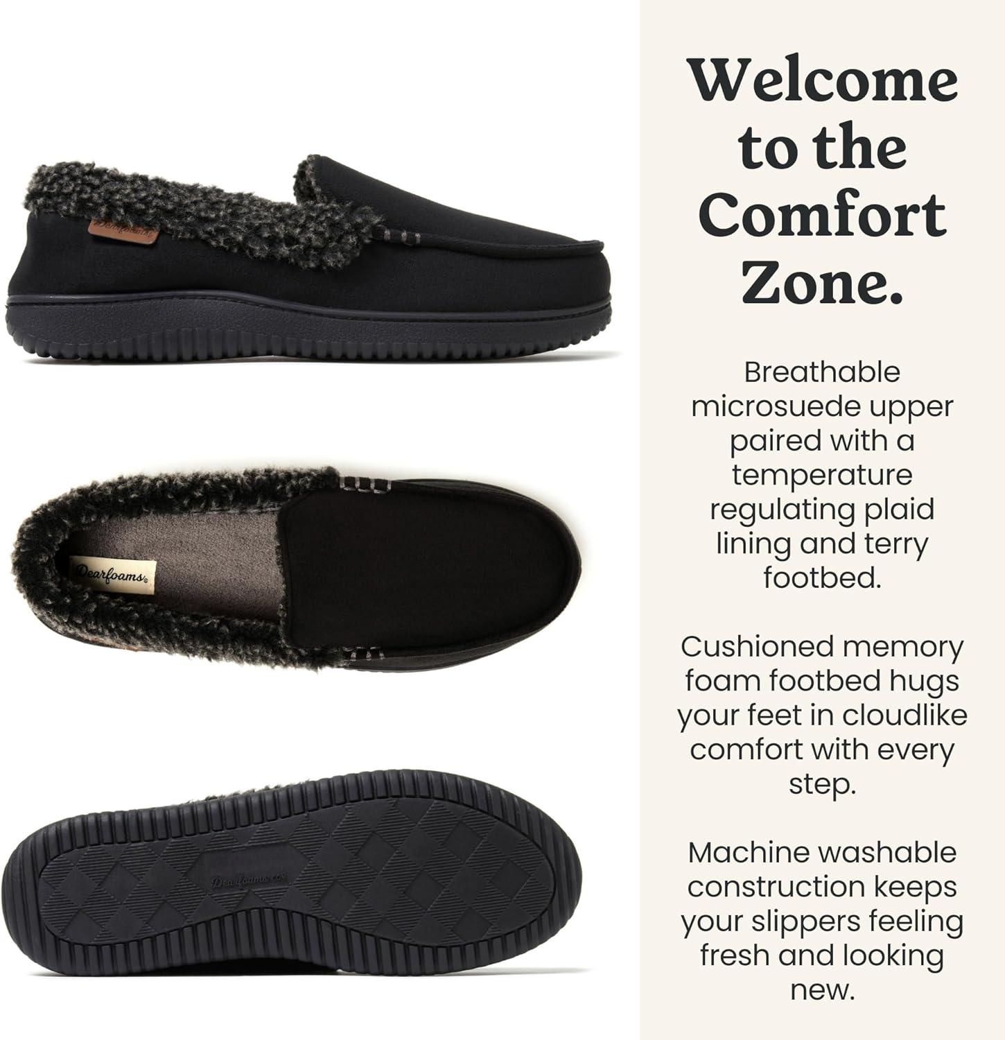 Dearfoams mens Gifts for Dad, Memory Foam Moccasin Slip on Breathable House Shoes Slippers(Black)