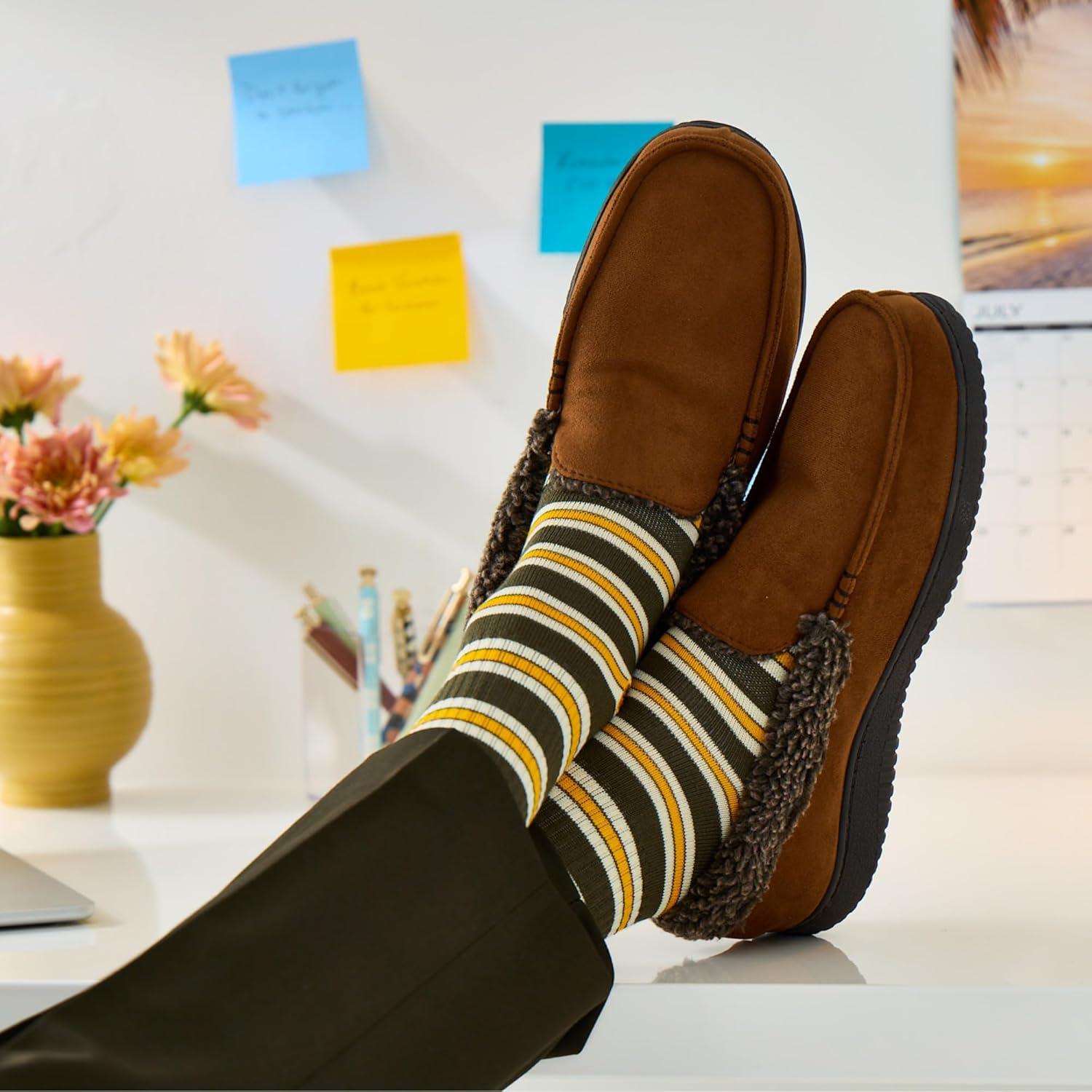 Dearfoams mens Gifts for Dad, Memory Foam Moccasin Slip on Breathable House Shoes Slippers(Chestnut)