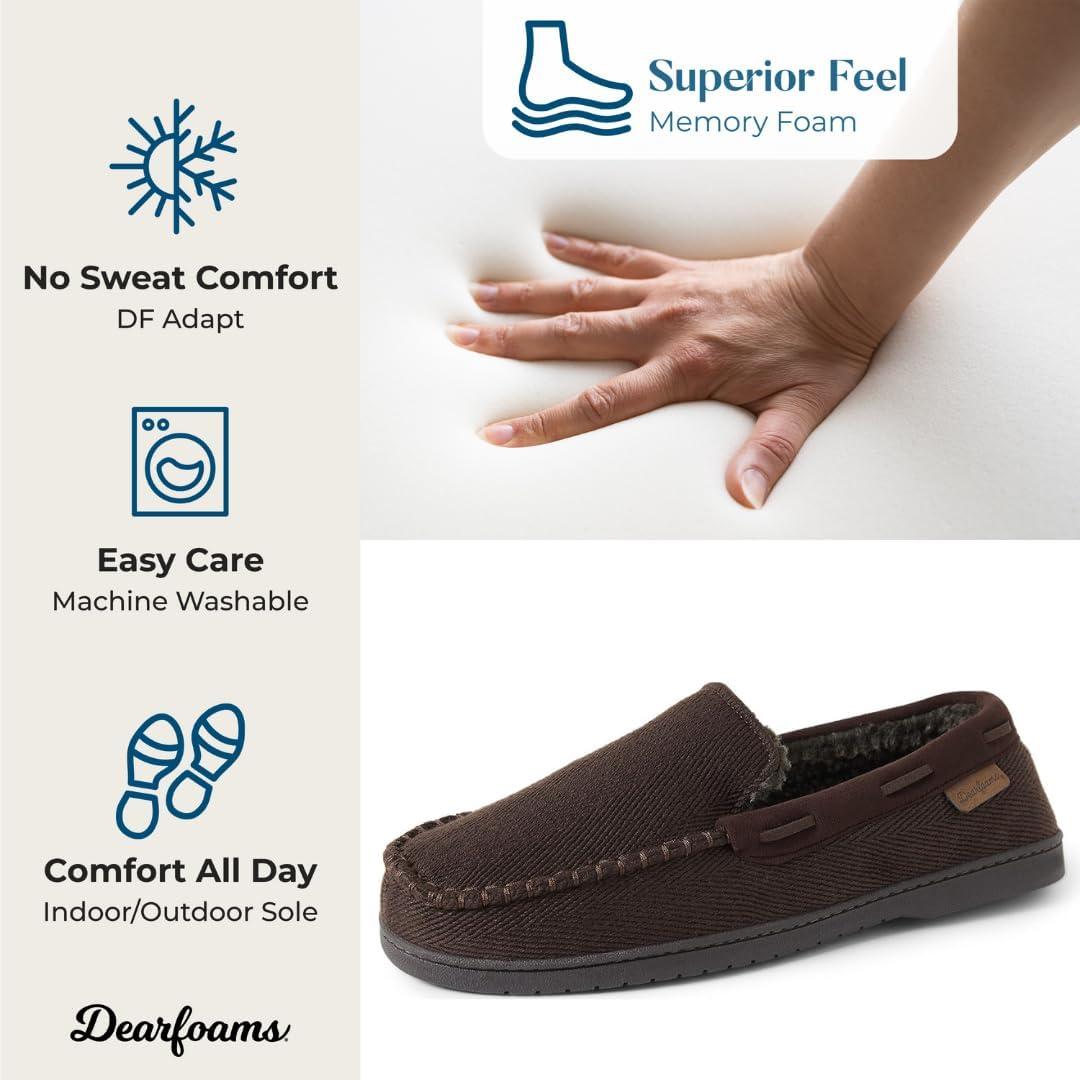 Constructed with quality materials, Dearfoams men’s slippers offer unbeatable comfort and timeless style!These indoor/outdoor slippers feature easy on/off designs alongside supersoft memory foam insoles. They’re the perfect choice for walking your dog around the block, grabbing the mail, taking out the trash, and more! Thanks to our innovative temperature-regulating DF Adapt designs, our men’s slippers are extra-breathable to help cut down on odor. Whether you’re looking for clog slippers, moccasin slippers, boot slippers, or closed back slippers, our men’s slippers are an extra-cozy, extra-smart pick! And when it’s time for a quick refresh, machine washable designs make keeping clean a breeze! Simply drop your slippers in the washer, set your machine toa gentle, cold cycle, and air dry; you’ll be back to relaxing in no time at all.
