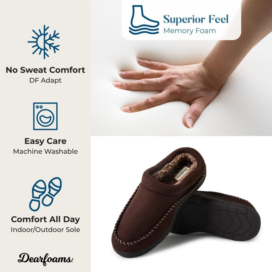 You can't go wrong with a classic look; and that's where our Thompson Clogs come in! We updated this timeless silhouette with a few modern-must have features like plush memory foam cushioning and innovative no-sweat comfort DF Adapt technology. Featuring durable indoor/outdoor outsoles, they're the perfect pick for both around-the-house lounging and on-the-go relaxation! Constructed with quality materials, Dearfoams men’s slippers offer unbeatable comfort and timeless style!These indoor/outdoor slippers feature easy on/off designs alongside supersoft memory foam insoles. They’re the perfect choice for walking your dog around the block, grabbing the mail, taking out the trash, and more! Thanks to our innovative temperature-regulating DF Adapt designs, our men’s slippers are extra-breathable to help cut down on odor. Whether you’re looking for clog slippers, moccasin slippers, boot slippers, or closed back slippers, our men’s slippers are an extra-cozy, extra-smart pick! And when it’s time for a quick refresh, machine washable designs make keeping clean a breeze! Simply drop your slippers in the washer, set your machine toa gentle, cold cycle, and air dry; you’ll be back to relaxing in no time at all.