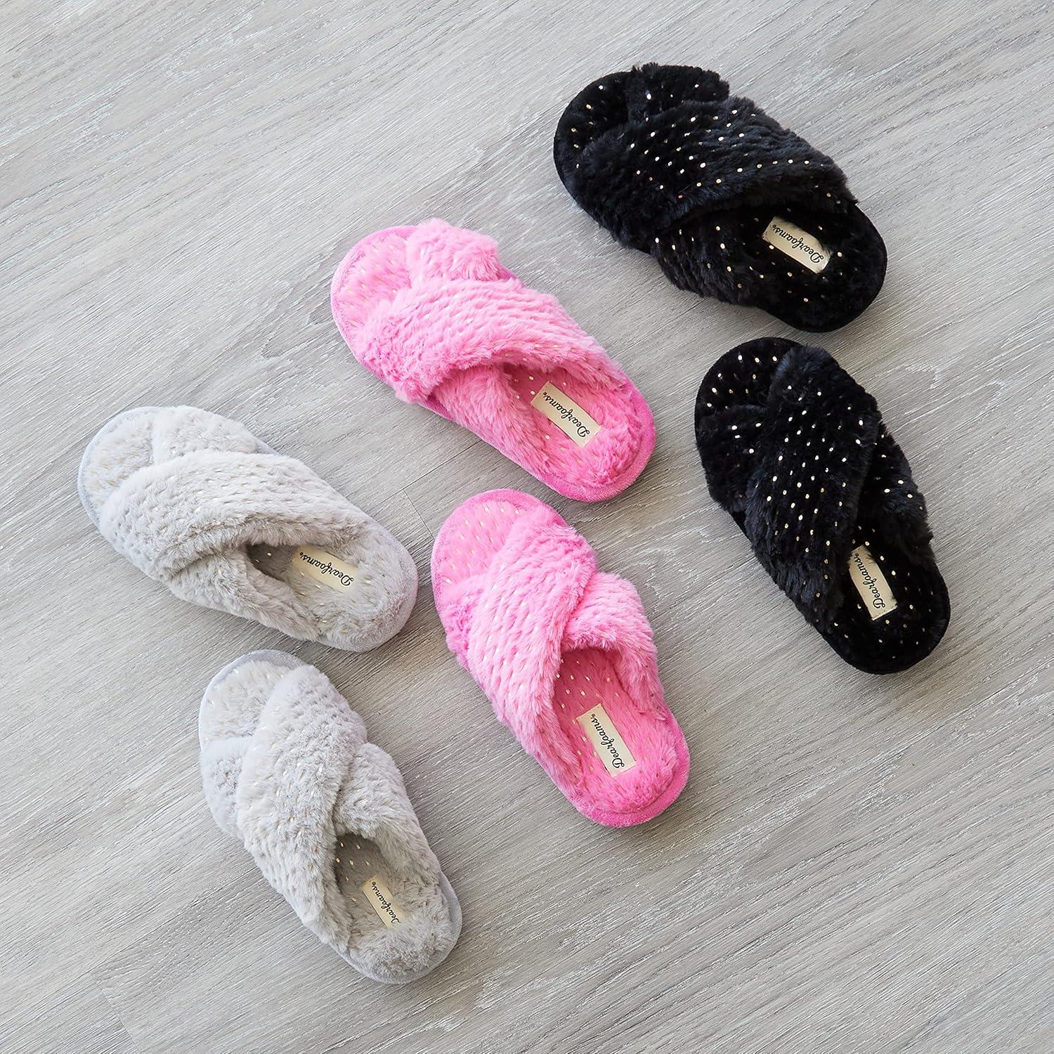 Os pequenos certamente vão adorar estes chinelos extrabrilhantes! As palmilhas peludas e o amortecimento de espuma viscoelástica ajudam a manter seus dedos torrados, enquanto as solas duráveis para ambientes internos/externos são perfeitas para dias agitados de diversão.