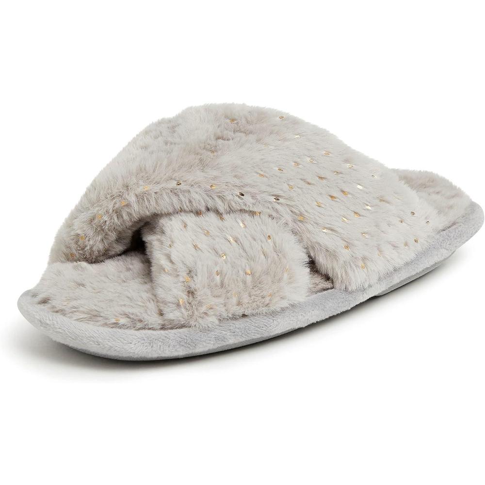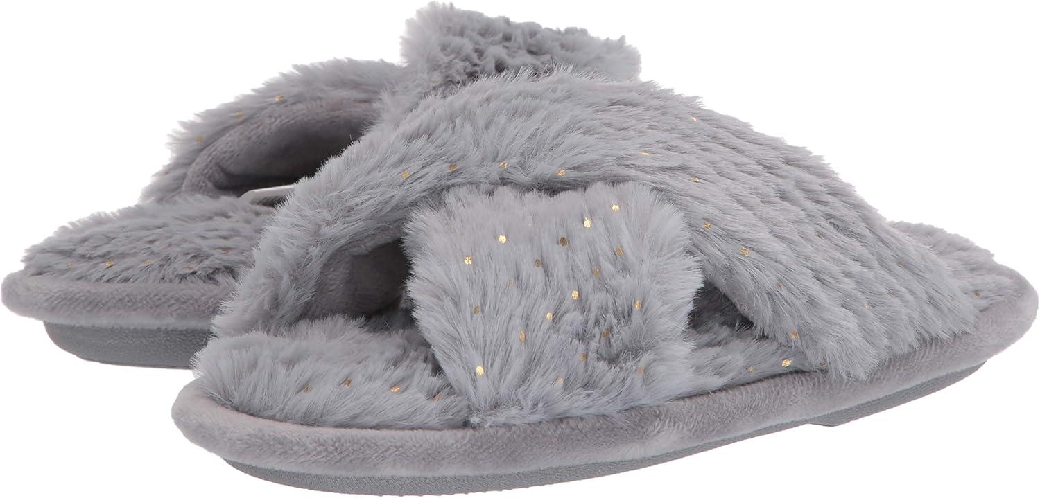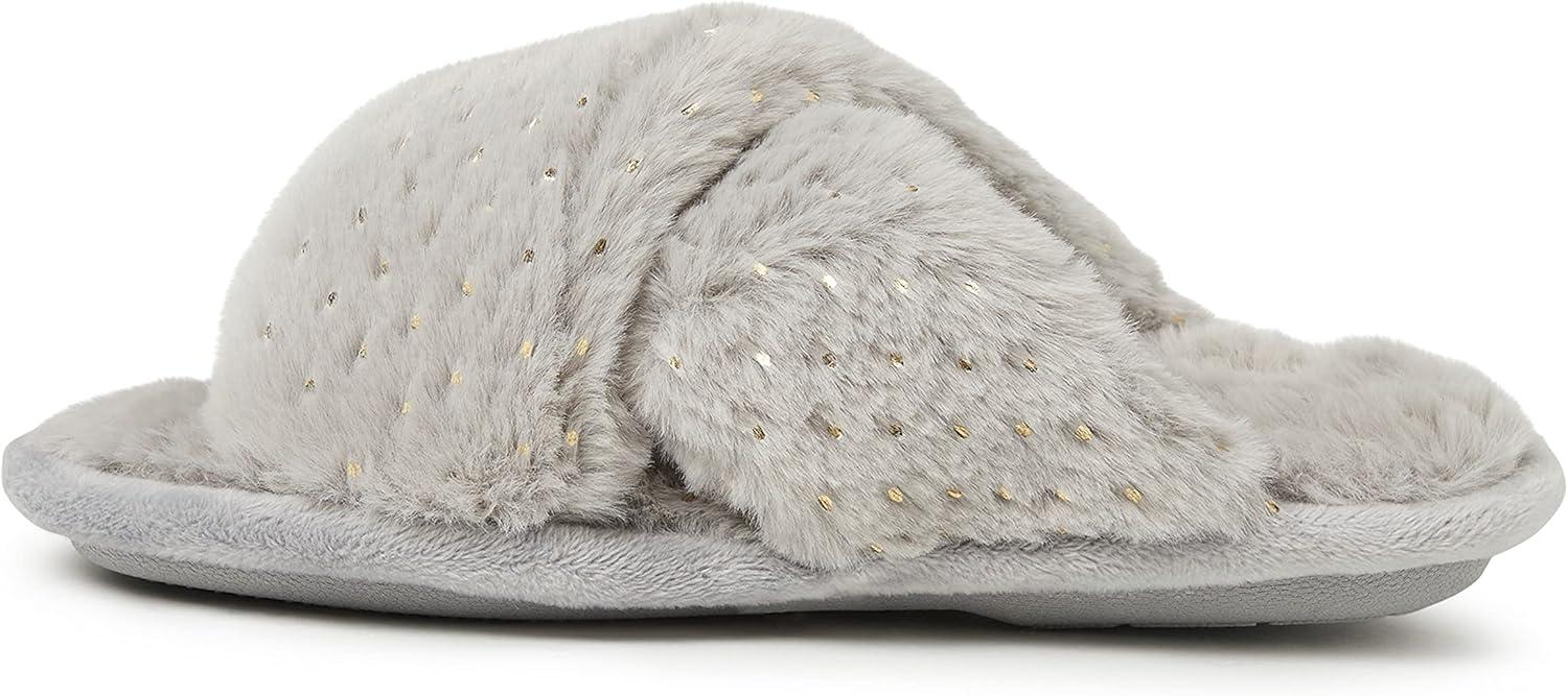 Dearfoams Unisex-Child Ava Kids Printed Detail faux faux fur Cross Band Slide Slipper(Sparkle Grey)