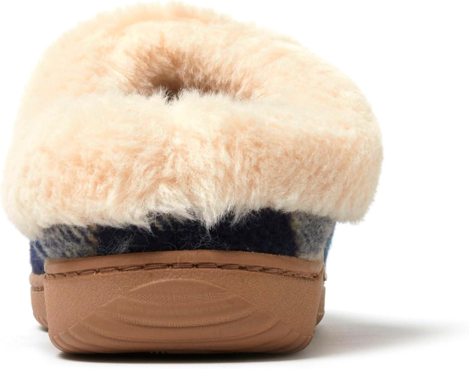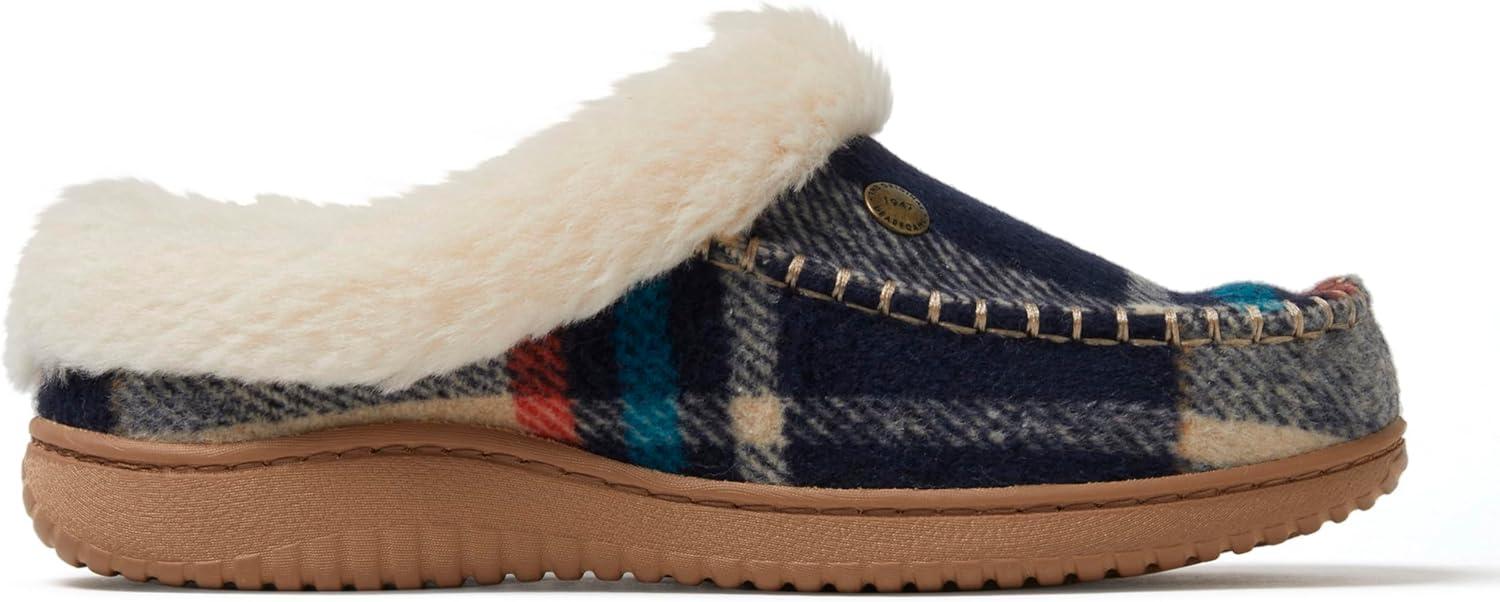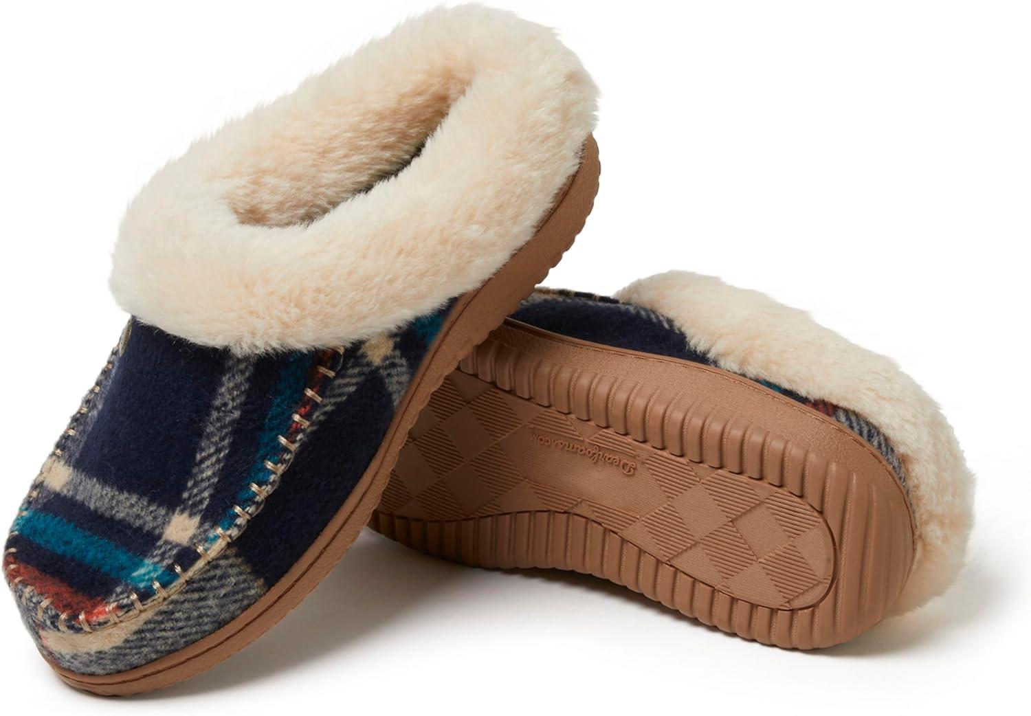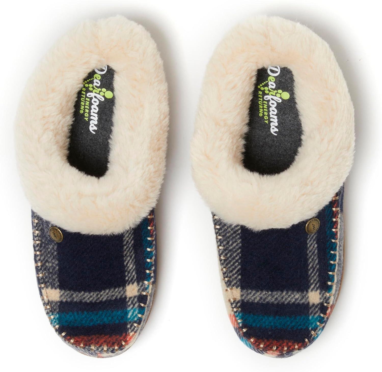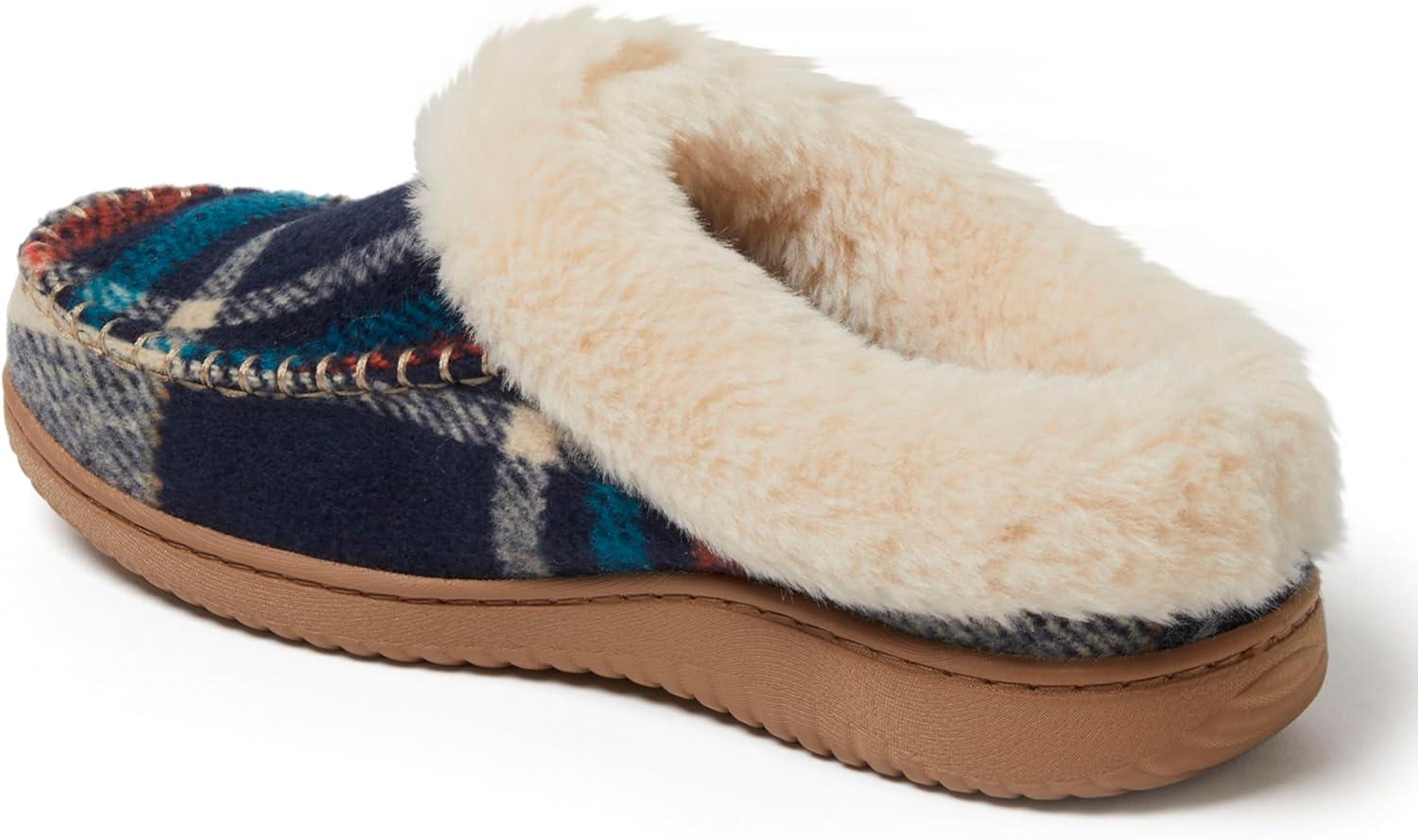 Dearfoams Women’s Atley Indoor Outdoor House Shoe Fuzzy Memeory Foam Clog Slipper(Navy Plaid)