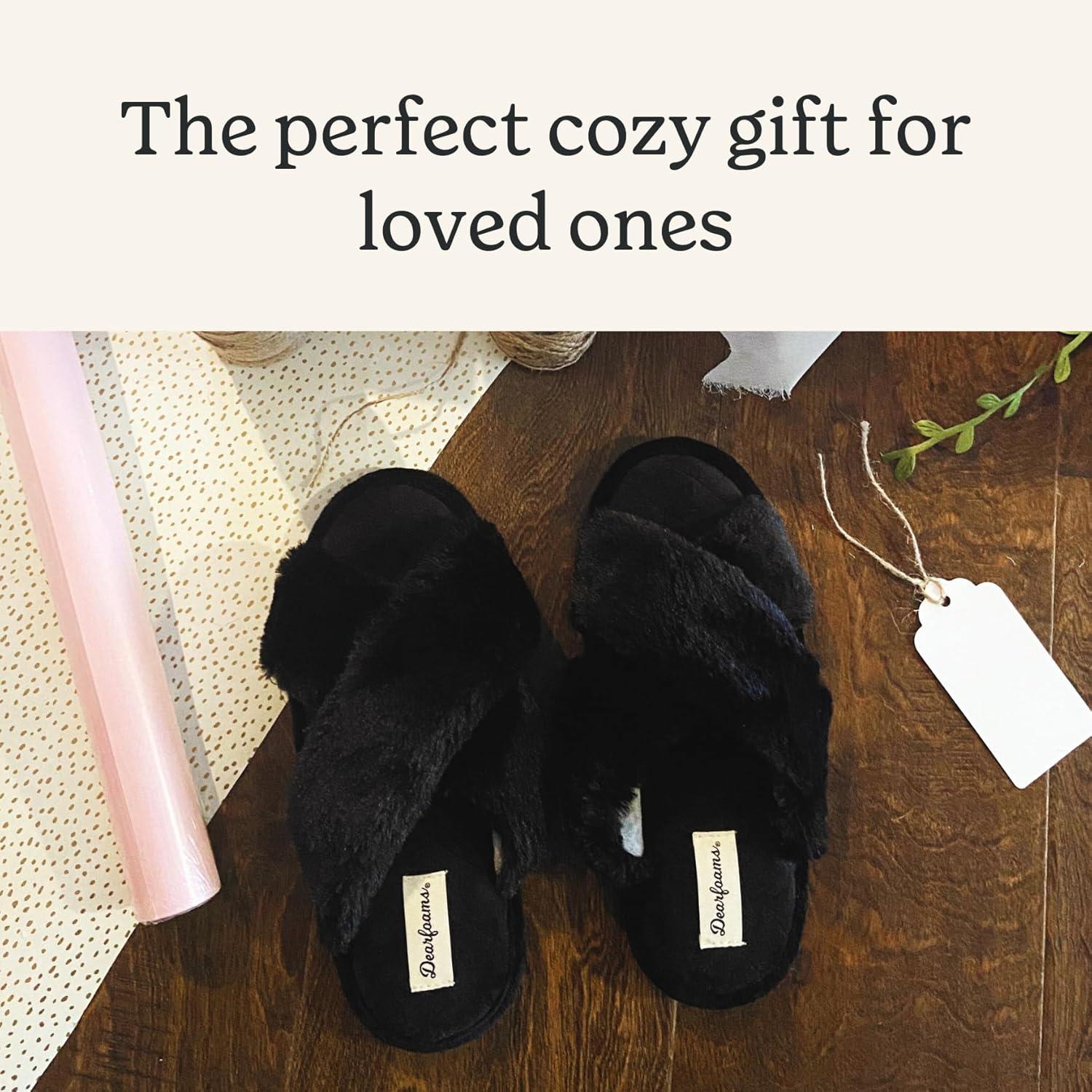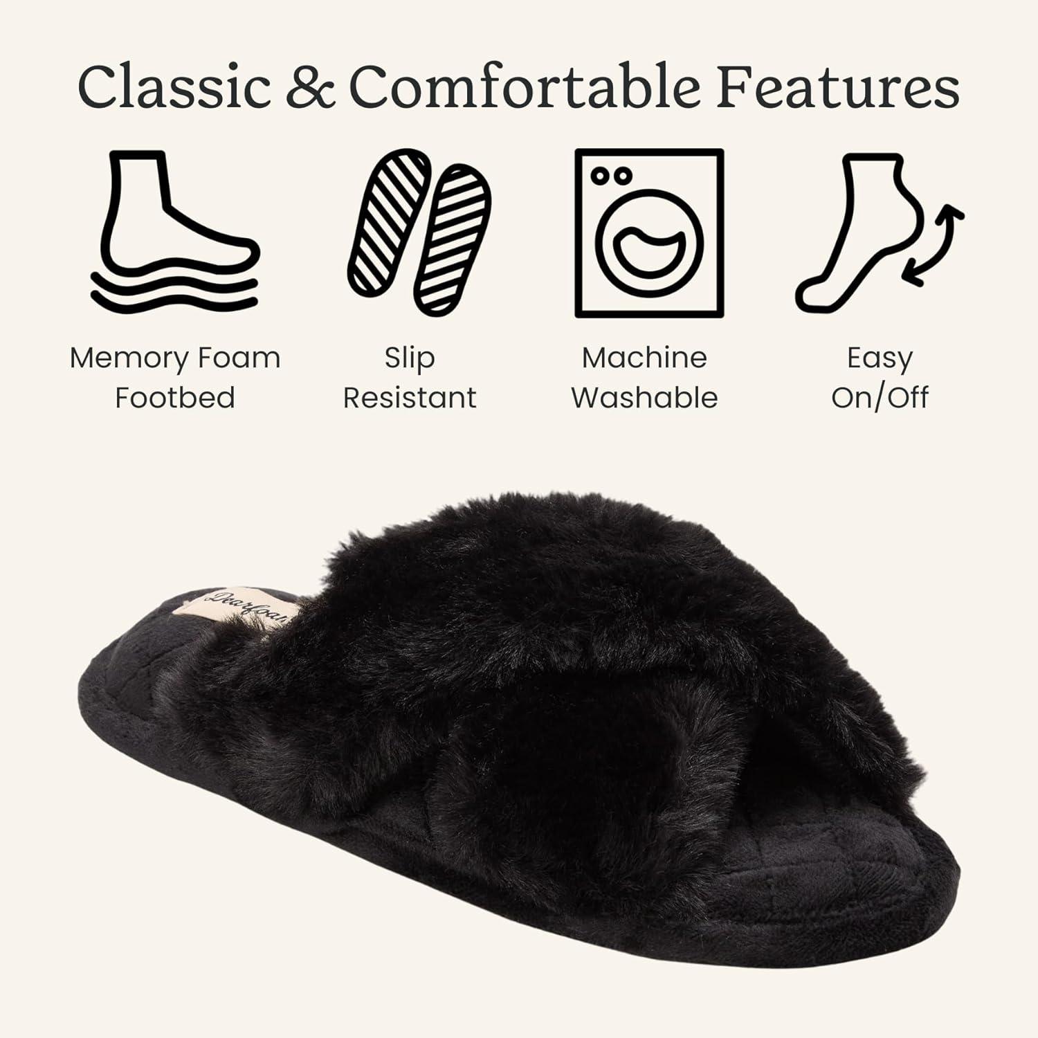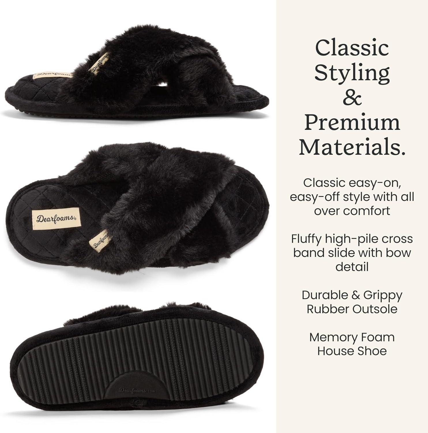Dearfoams Women’s Jessica Fuzzy Cross Band Slide Slipper(Black)