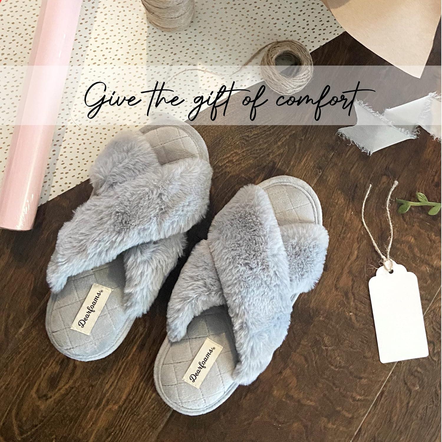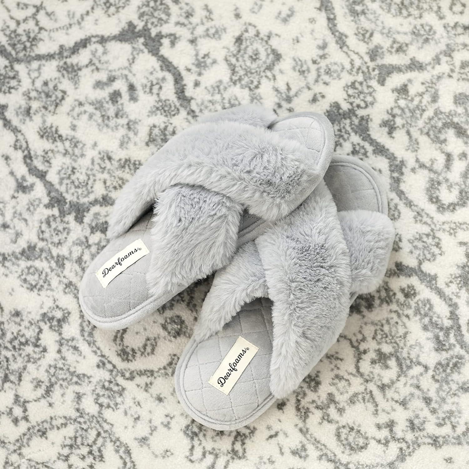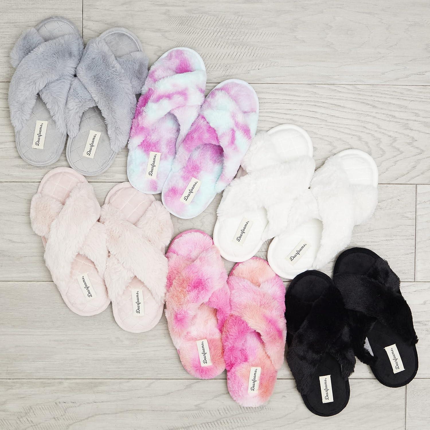 Dearfoams Women’s Jessica Fuzzy Cross Band Slide Slipper(Sleet)