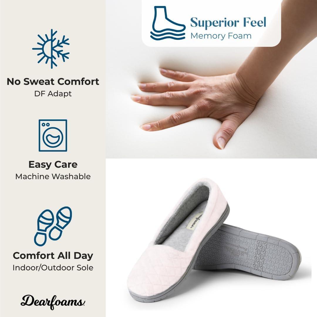 Start your morning off right by sliding into a pair of Dearfoams. With a rubber sole, our velour slippers can be worn indoors while getting ready for the day or outside if you need to grab the mail or walk the dog. A closed back creates a secure feel around the foot, while a quilted design adds an elegant touch. Plus, Dearfoams velour slippers are designed with a multi-density cushioned insole with memory foam for instant comfort. Cleaning them is easy — simply machine wash in cold water and lay flat to dry.