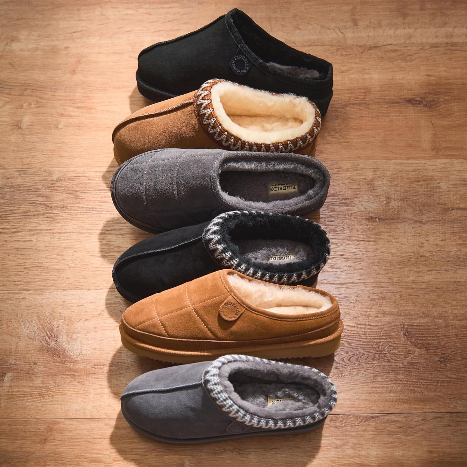 Luxury for everyone. That’s the idea behind the Fireside Collection: a line of slippers at an everyday price on superior quality competitive with other slipper brands. Perfect as a thoughtful gift for your loved ones, Fireside shearling slippers are sure to be their new favorite way to relax! Made with genuine Australian sheepskin lining, these affordable shearling slippers are a must for relaxing in style. But why shearling? Shearling boasts natural temperature-regulating and moisture-wicking properties. They’re a great blend of insulated and breathable, and a few of our styles even feature water-resistant designs to help protect you from the elements. Shearling is also known for its durability; these long-lasting slippers are sure to be favorites for years to come! Temperature-regulating and moisture-wicking slippers are perfect no matter the weather, and these indoor/outdoor slippers are built to handle the busiest of days. Our men’s shearling slippers, women’s shearling slippers, and kids’ shearling slippers are designed with unbeatable quality in mind.