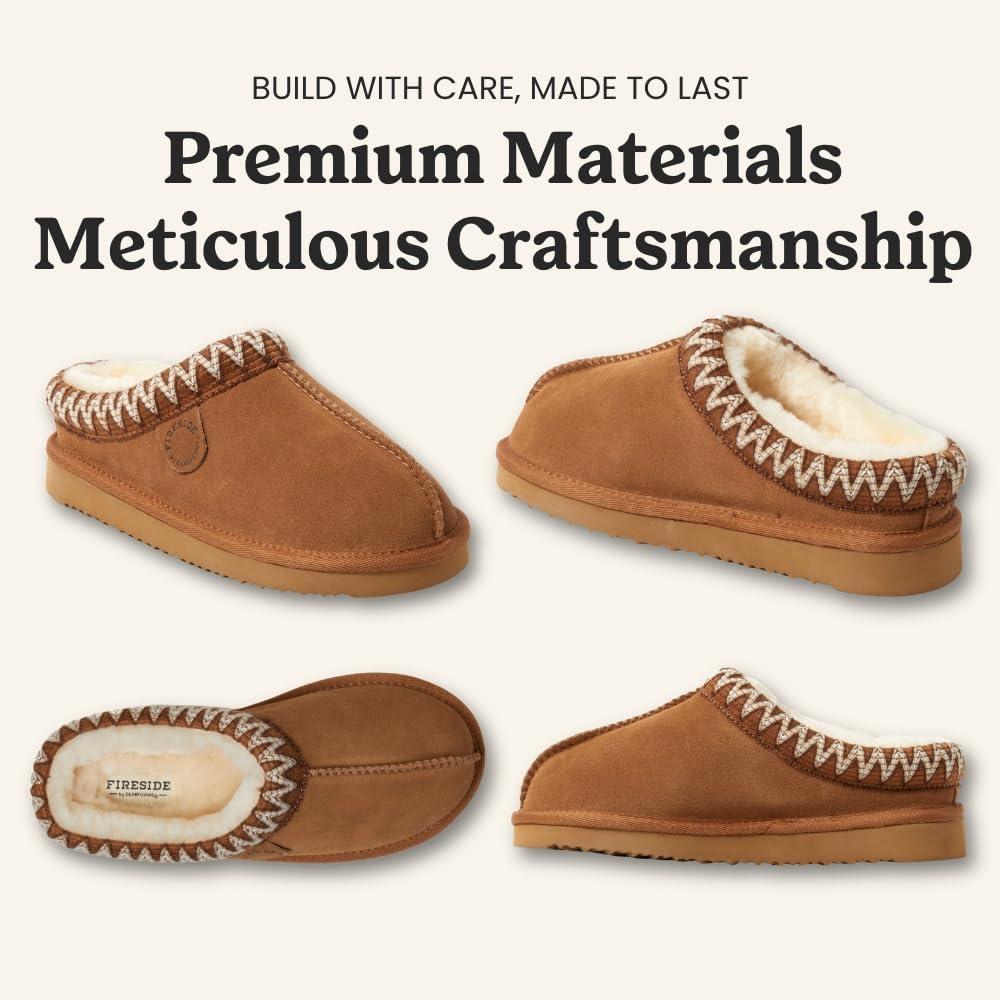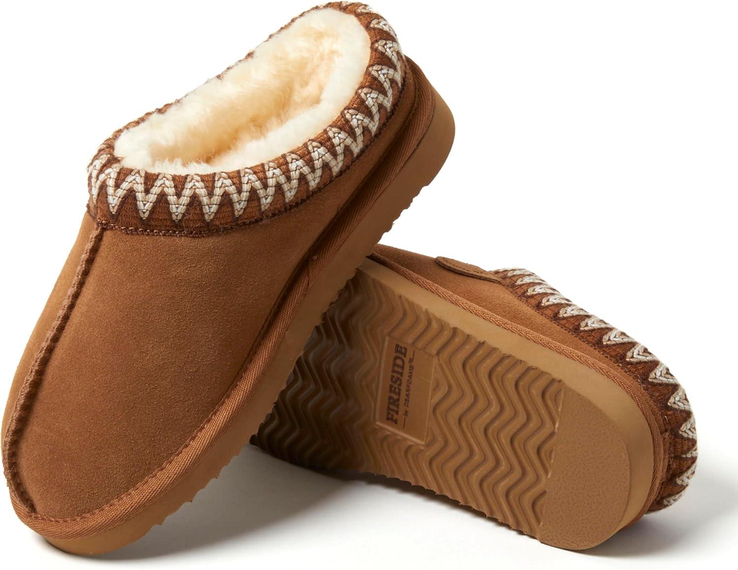Fireside by Dearfoams Women’s Greta Genuine Shearling Clog Slippers, 100% Natural Suede Clogs for Outdoor & Indoor(Chestnut Taping)