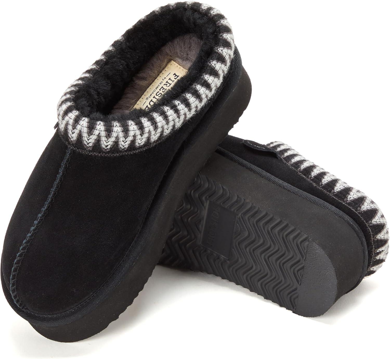 Fireside By Dearfoams Women’s Queenstown Shearling Slippers, Memory Foam Suede Clog, Indoor/Outdoor Slip-in House Shoes(Black Taping)