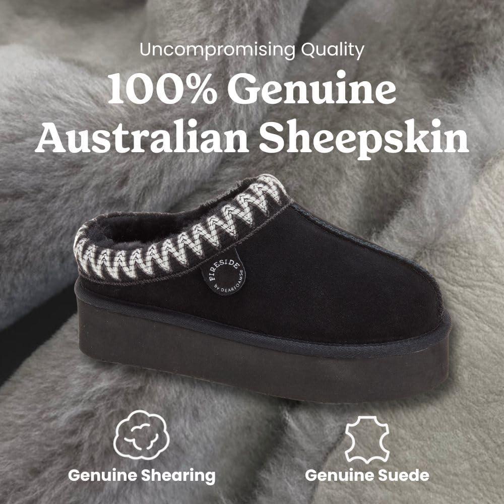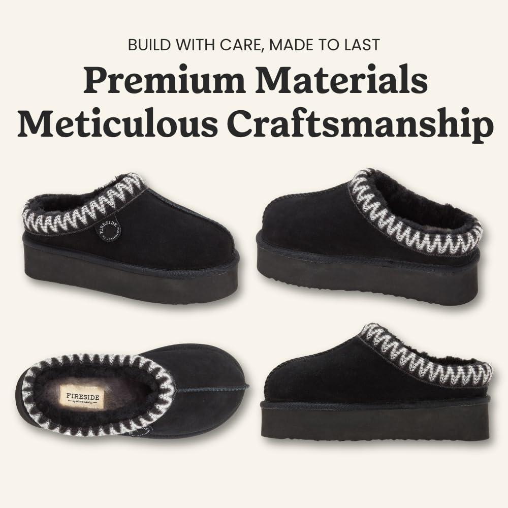 Fireside By Dearfoams Women’s Queenstown Shearling Slippers, Memory Foam Suede Clog, Indoor/Outdoor Slip-in House Shoes(Black Platform)