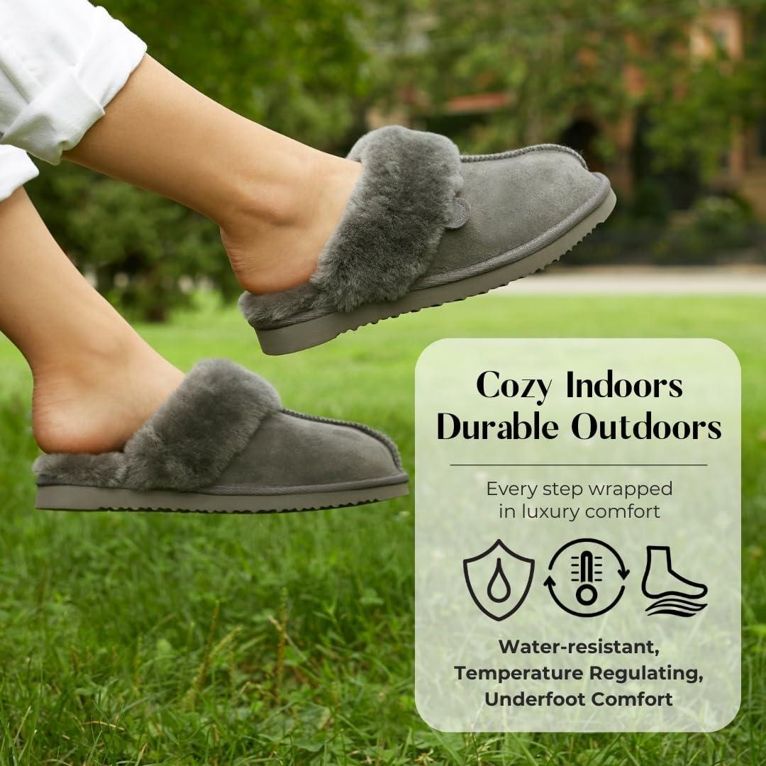 Fireside By Dearfoams Women’s Sydney Slippers, Genuine Shearling Suede Scuffs, Memory Foam Slip-in House Shoes(Grey)